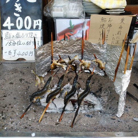 [Caption: Fish flags and cherry blossoms near the sake festival and fresh river fish on a stick; both in Hiraizumi, Japan ]